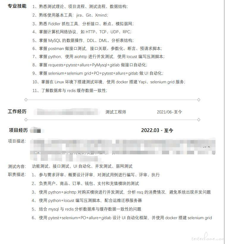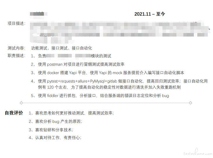 1、把简历中的 2 个项目相同的工作内容,如功能测试、接口测试,主要贡献是什么,包括技术,业务,流程,人员指导等,最好有数据,以展示自己的能力(目前是平铺直叙流水帐式描述)