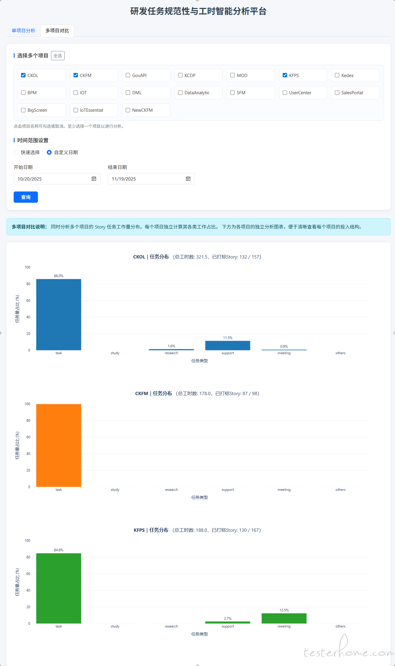 同时分析多个项目的 Story 任务工作量分布。每个项目独立计算其各类工作占比。
