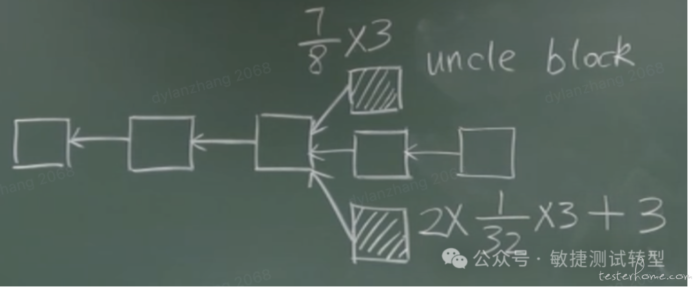 而以太坊为了鼓励主链的矿工引用叔叔区块,每引用一个叔叔区块,主链矿工额外获得 0.0625 以太币,但最多可以设置两个叔叔区块,如果设置太多可能导致以太币贬值。