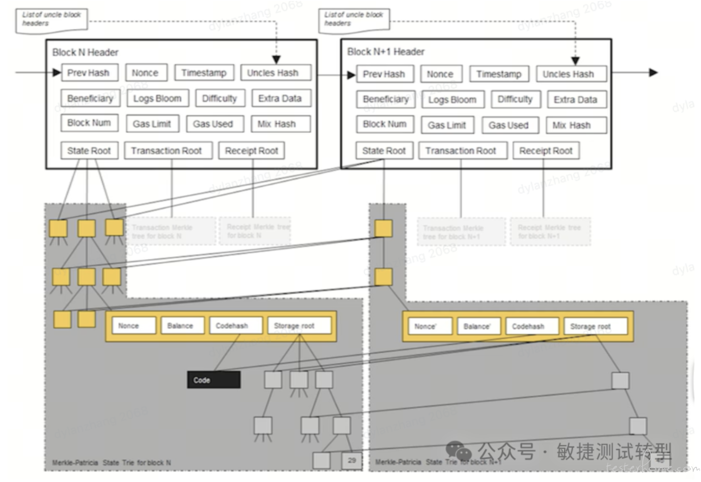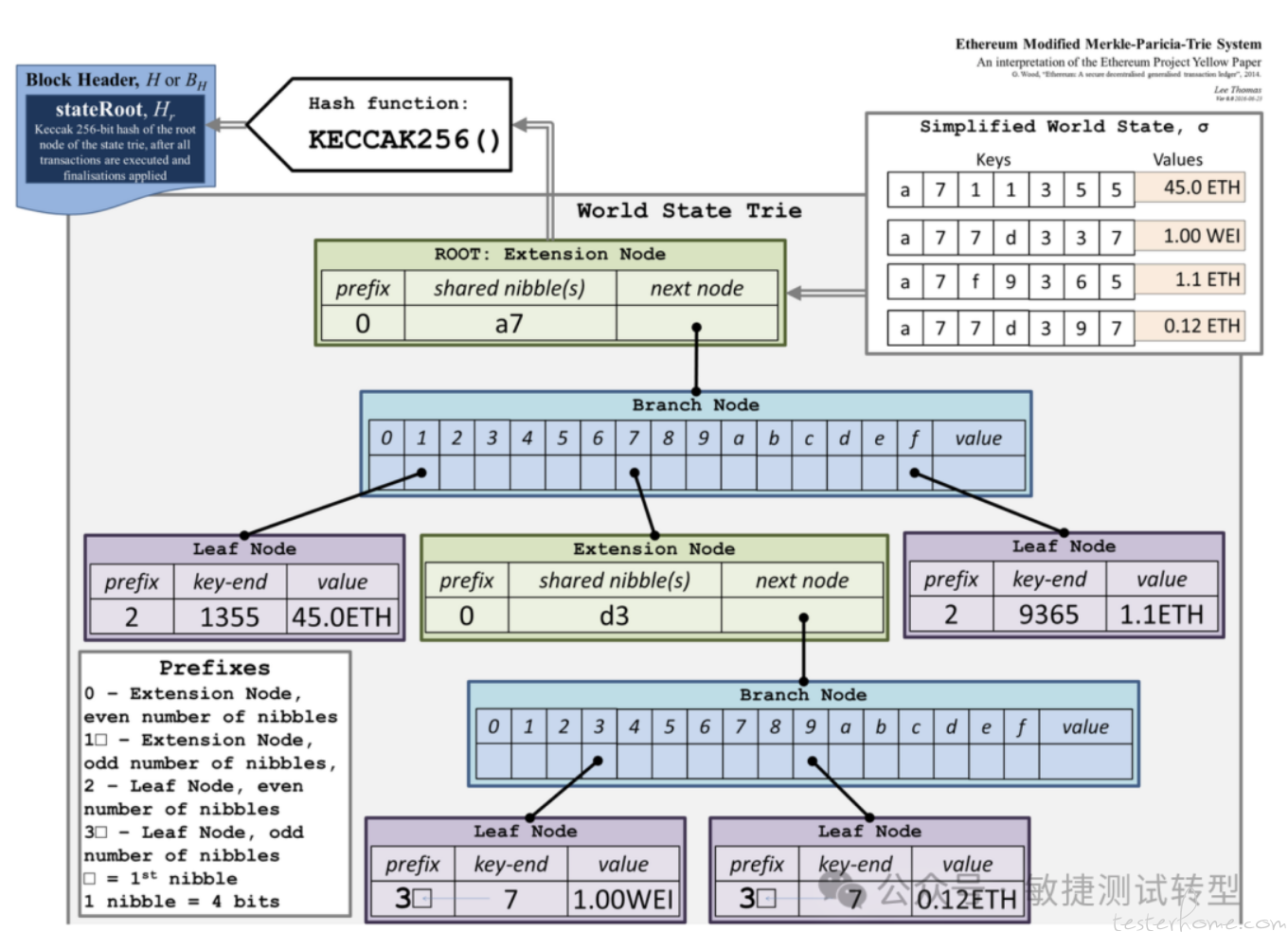 以太坊的核心数据结构是 Merkle Patricia Trie(MPT),它是一种结合了 Merkle Tree 和 Patricia Trie 的树形结构,用于高效存储和验证区块链的状态、交易和收据等数据。因此以太坊包含四棵不同类型的树,它们构成了智能合约生态的底层基石: