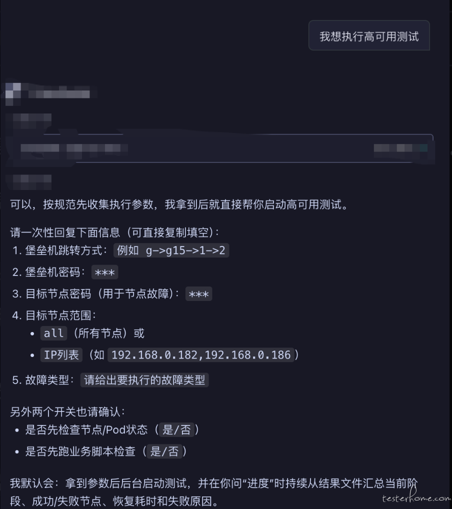 1. 如果用户要测试高可用,则需要先向用户收集必要的参数。 比如 堡垒机跳转方式, 堡垒机密码, 目标节点密码,目标节点ip(可以让用户选择all,或者某几个具体的ip),故障类型。