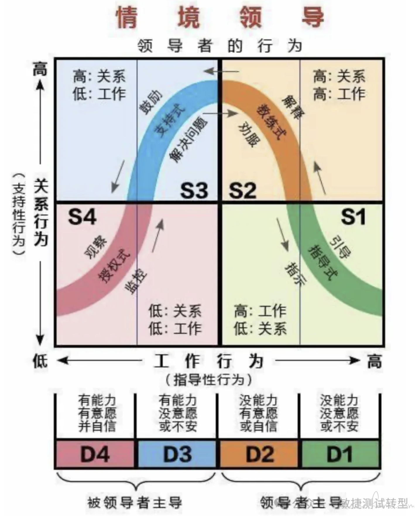 经典划分是 “情景领导” 的 “能力” 和 “意愿” 划分法,针对不同的组合实施不同策略: