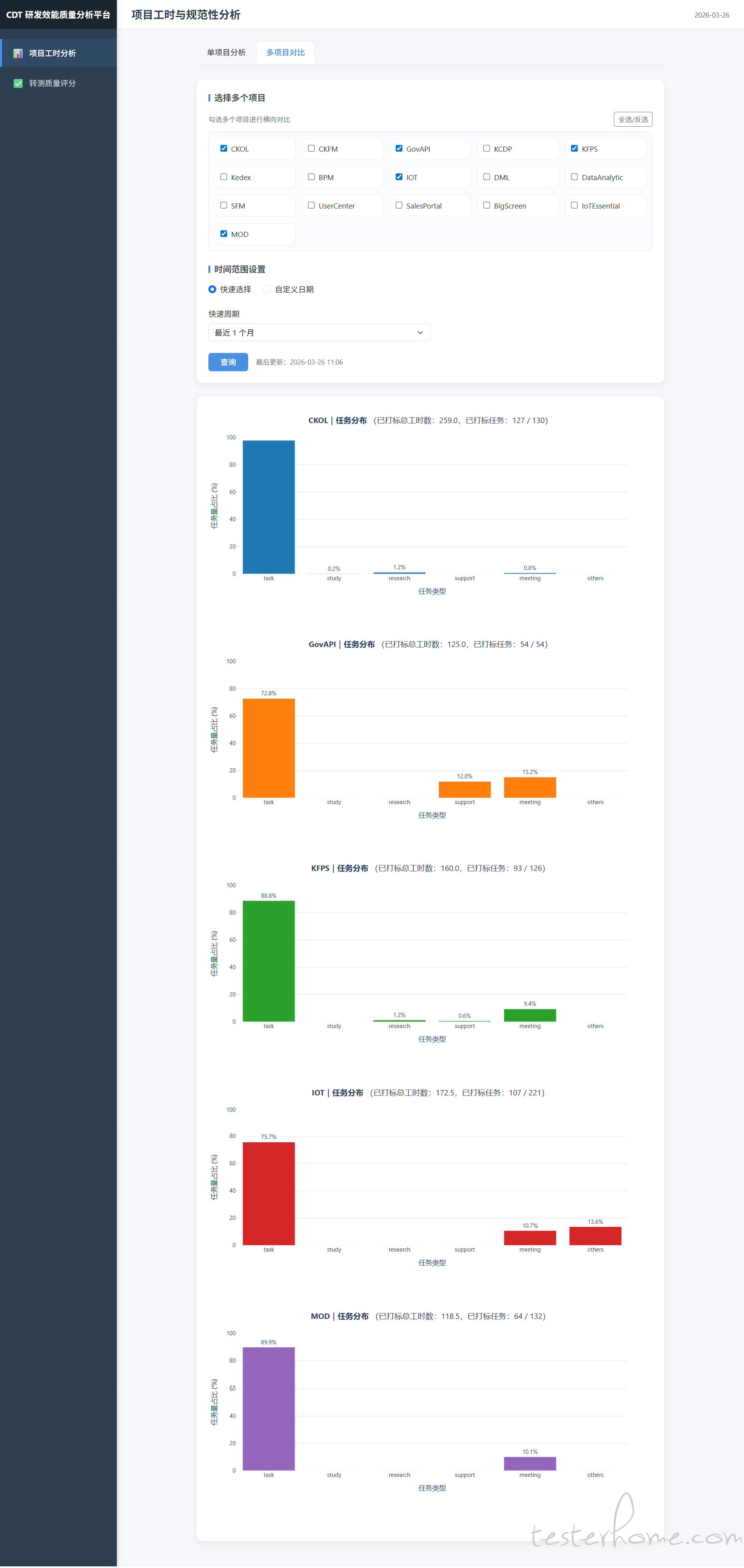 为此,CDT 研发效能质量分析平台应运而生,旨在通过数据驱动实现管理闭环。平台一方面深度集成 JIRA 数据,提供灵活的时间周期选择与多项目对比视图,直观呈现工时偏差趋势以辅助精准排期;另一方面构建标准化的转测质量打分体系,将开发文档、设计评审、冒烟测试、API 规范及 Git Flow 执行五大维度转化为百分制实时评分,并自动标记转测延迟状态。通过将隐性的研发过程显性化、主观的评价客观化,平台将有效打破效能与质量的数据孤岛,推动研发团队从 “经验驱动” 向 “数据驱动” 转型,实现交付效率与产品质量的同步提升。