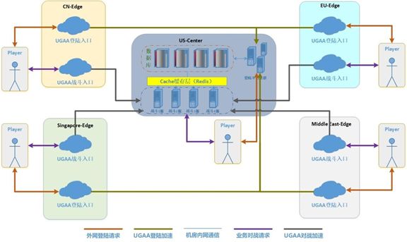 (1)平台操作仍然集中化部署玩家统一访问,如日常操作、装备购买等延迟不敏感操作;(2)对战房间分布于全球各个数据中心,而当玩家需要对战、进行匹配分房时,通过算法调度到相对大多数用户最近的节点;