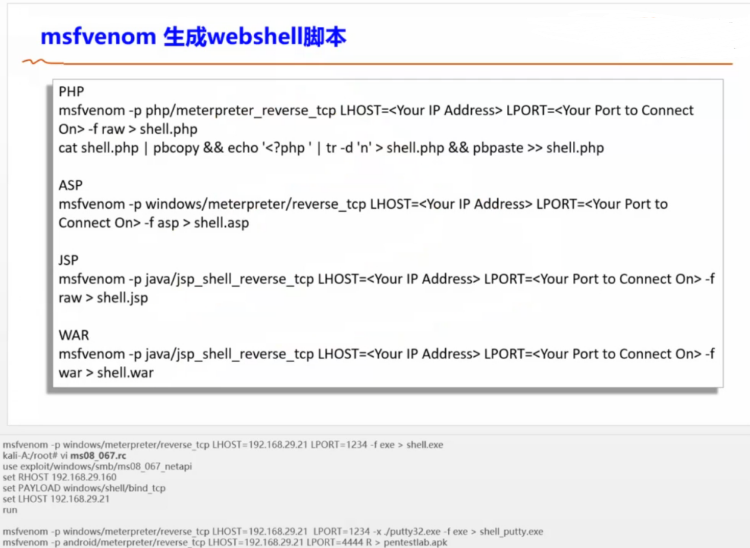 上面是linux上的一条命令,属于msf的一个工具集。就是指定了LHOST=192.168.29.21 LPORT=1234这样的参数,生成了exe文件,还可以注入到别的程序中去,加一个-x(后面是在windows上执行的)