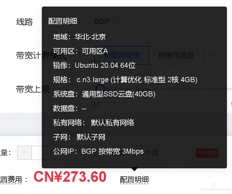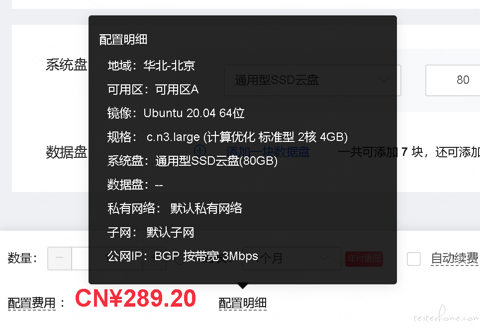 最终我决定降低些配置,节省下预算,毕竟现在寒冬来了。将硬盘降低为 40GB,其余的保持不变,计划自己再往里面充值 3.4 元完成配置购置。