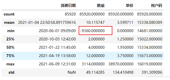 这里发现数量的最小值(min)是个负数,这显然不合理,所以我们要把这种脏数据去掉。
