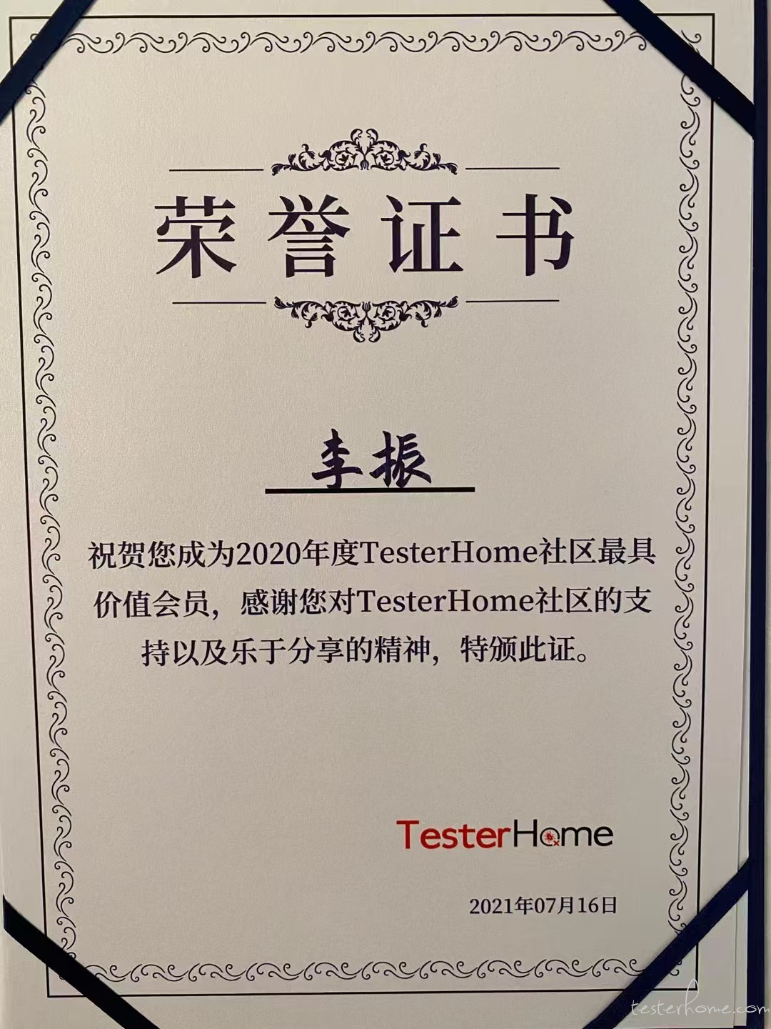 因为上一家公司离职时,不管文档还是平台,有问必答。就是因为上家公司的总结输出,无意中成为了 2020 年度 TesterHome 社区最具价值会员,在新公司面试时可以作为影响力的重要佐证,面试官也会慕名阅读你的文章,并为你加分很多。