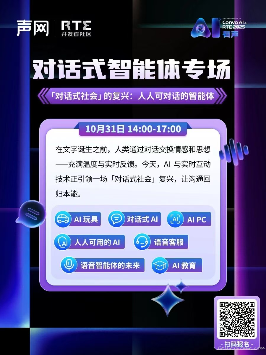 来 Convo AI & RTE2025 技术专场论坛,头部玩家与行业技术领袖将为你一一揭晓答案!本次技术专场论坛覆盖 7 大技术领域,汇聚 40+ 顶尖技术专家与学者,共同探讨对话式 AI 与实时互动的前沿技术、落地场景与未来演进。\