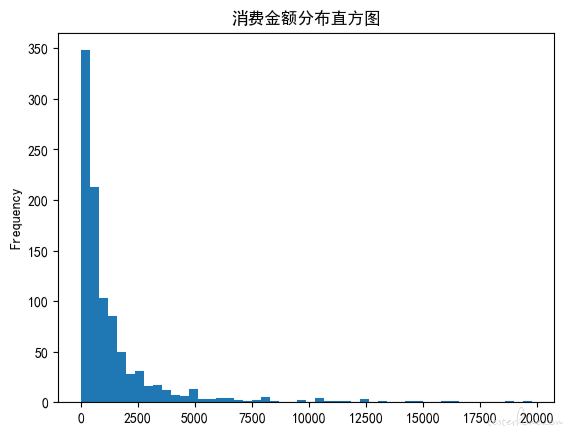 df_user.query('M值 < 20000')['M值'].plot(kind='hist', bins=50, title = '消费金额分布直方图') #M值直方图