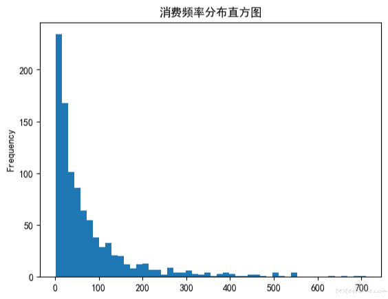 df_user.query('F值 < 800')['F值'].plot(kind='hist', bins=50, title = '消费频率分布直方图') #F值直方图
