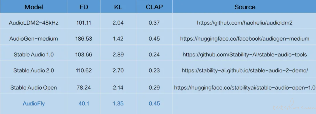 在未进行针对性微调的情况下,AudioFly 在学术数据集 AudioCaps 测试集上取得了 SOTA 指标,证明了该模型良好的推广性和鲁棒性。