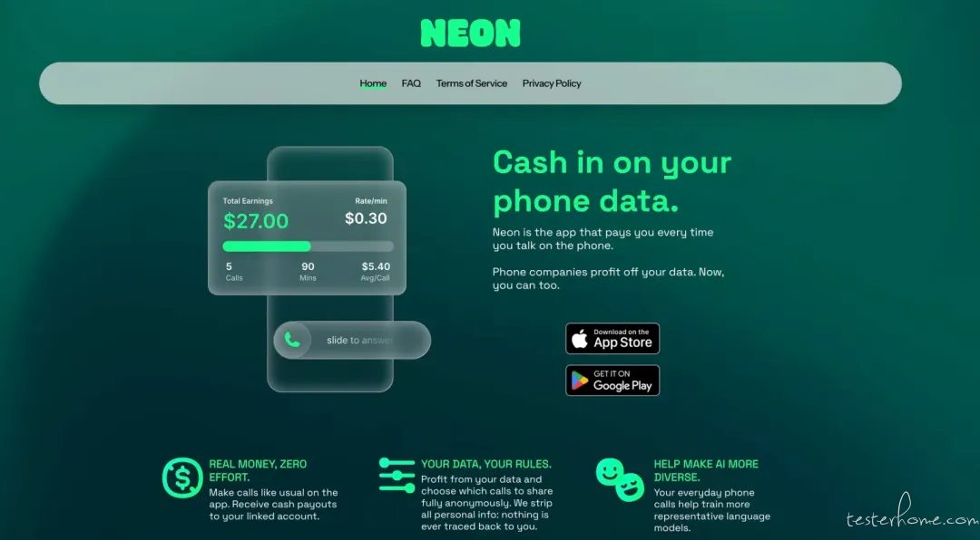 • 付费录音与数据出售: Neon Mobile 宣称支付用户每分钟 30 美分(拨打给其他 Neon 用户)或高达每天 30 美元(拨打给其他任何人)的费用,以换取用户电话录音的使用权。其用户协议表明,这些数据将被出售给「AI 公司」,用于「开发、训练、测试和改进机器学习模型」。