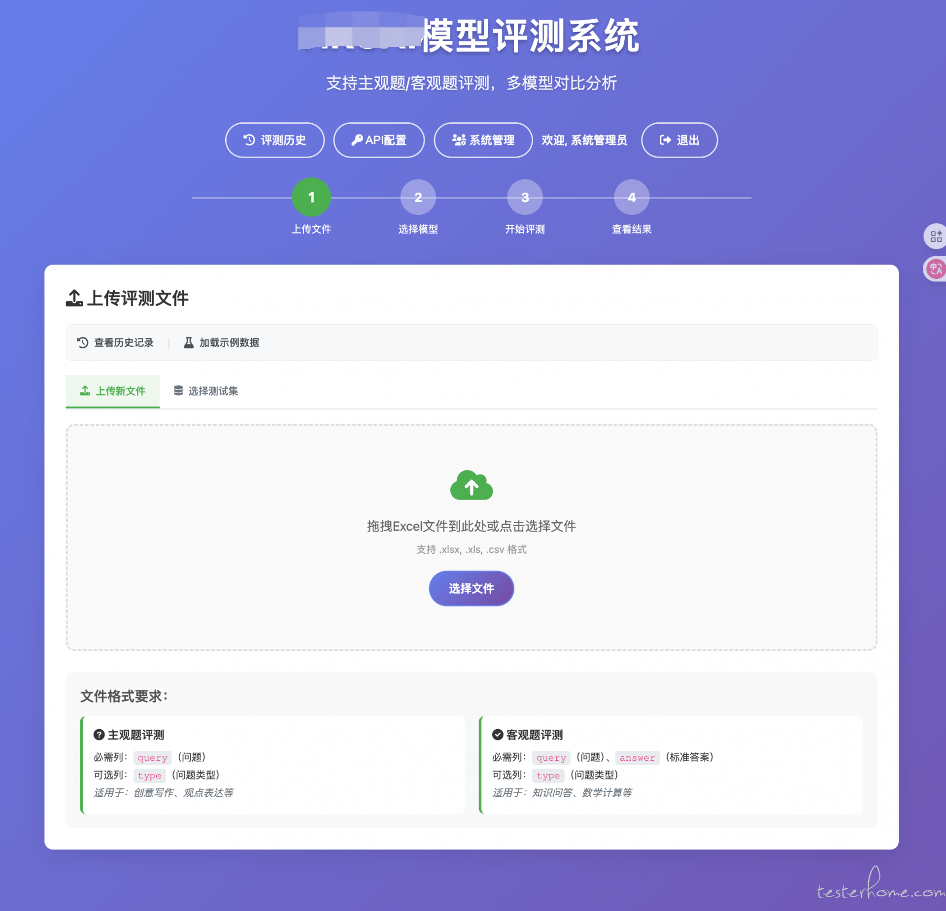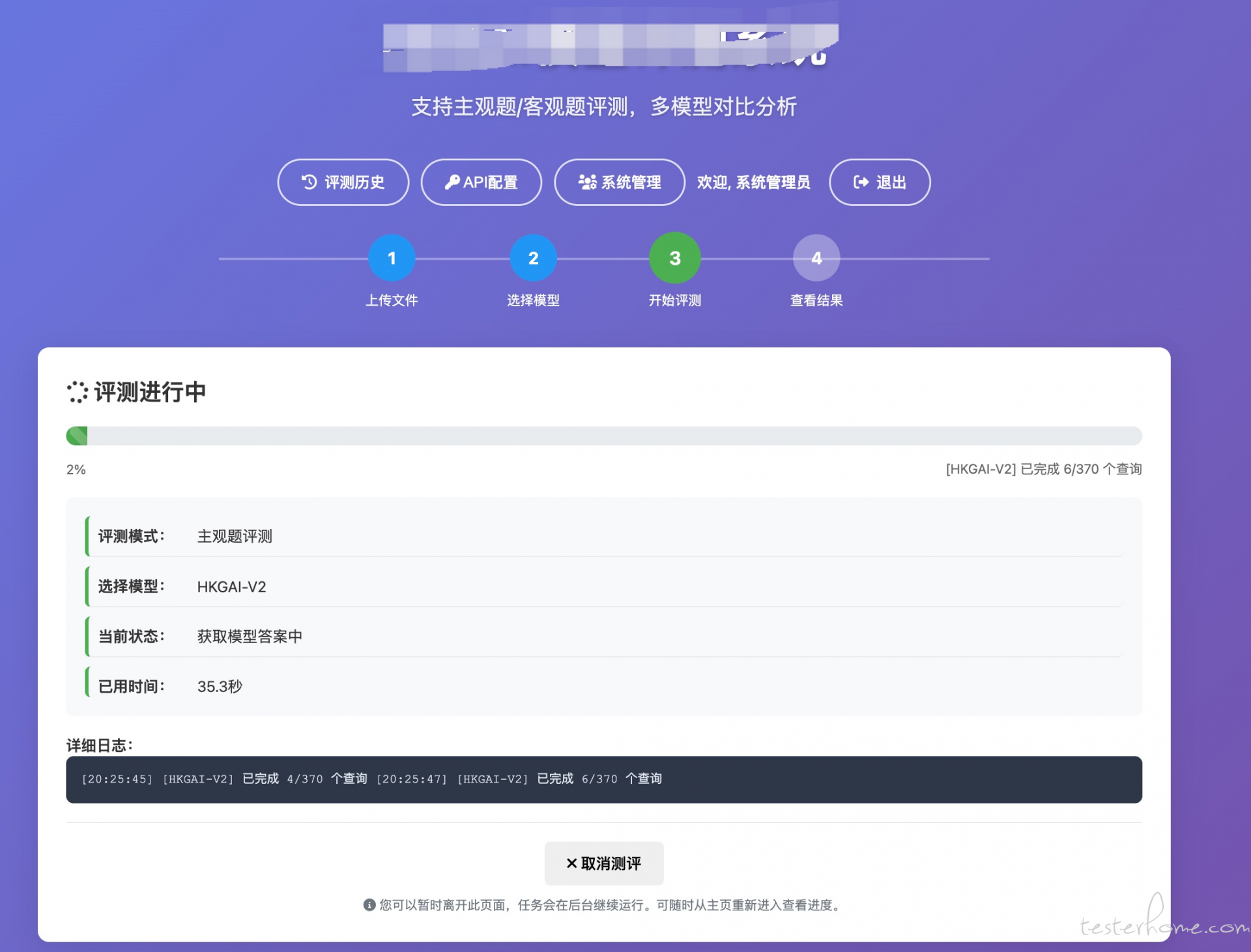 • 首页:上传区域、模型选择、裁判模型、评测模式、开始按钮。