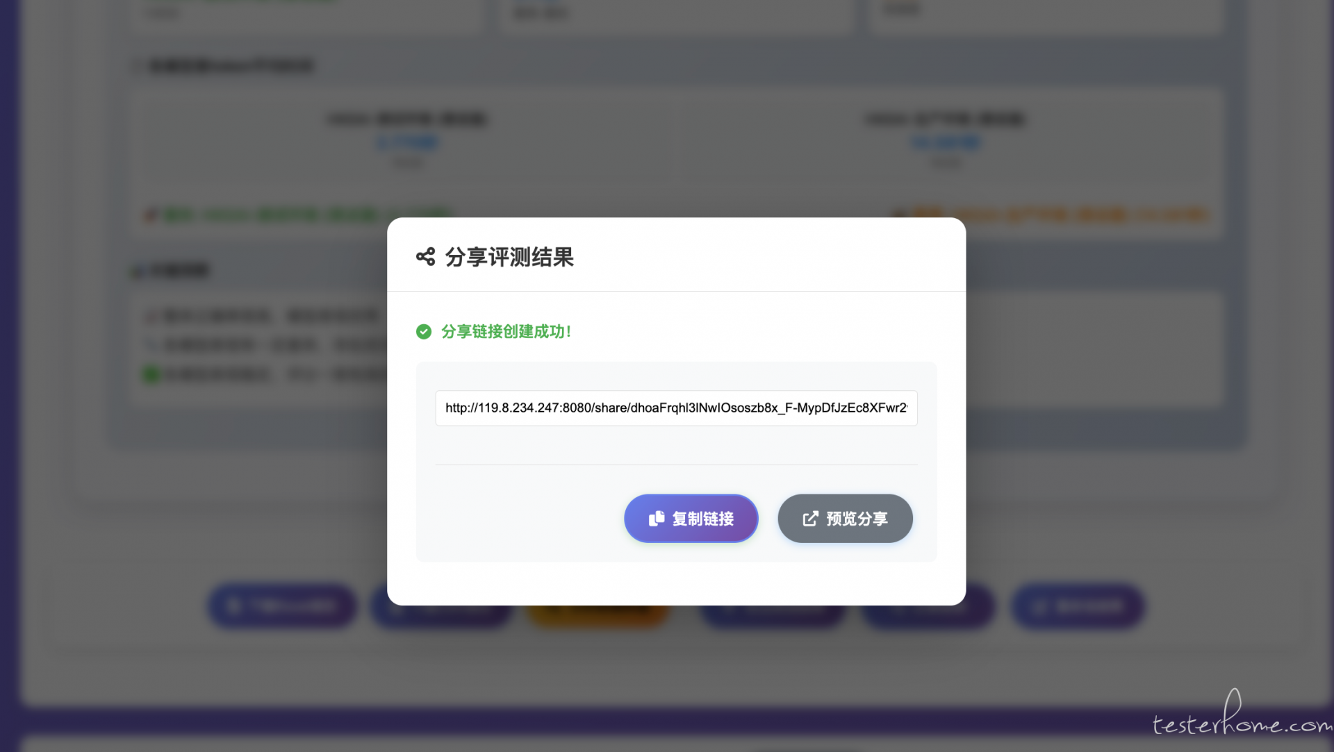 • 历史/分享:历史列表与分享入口,展示 “评测如何沉淀为资产”。