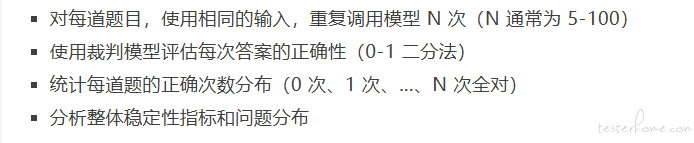 稳定性测评的核心思想是:对同一个问题进行 N 轮重复测试,分析模型答案的一致性和正确率分布。