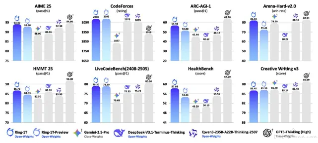 该模型沿用了 Ling-1T-base 底座,通过大规模可验证奖励强化学习(RLVR)与 RLHF 继续训练。官方宣称,Ring-1T 在数学竞赛、代码生成、逻辑推理等硬核基准上取得了开源 SOTA 成绩,其中 AIME 25、HMMT 25、ARC-AGI-1、CodeForce 均位列榜首,在综合任务 Arena-Hard-v2.0、医疗 HealthBench、创意写作 Creative Writing v3 等领域也保持强劲得分。