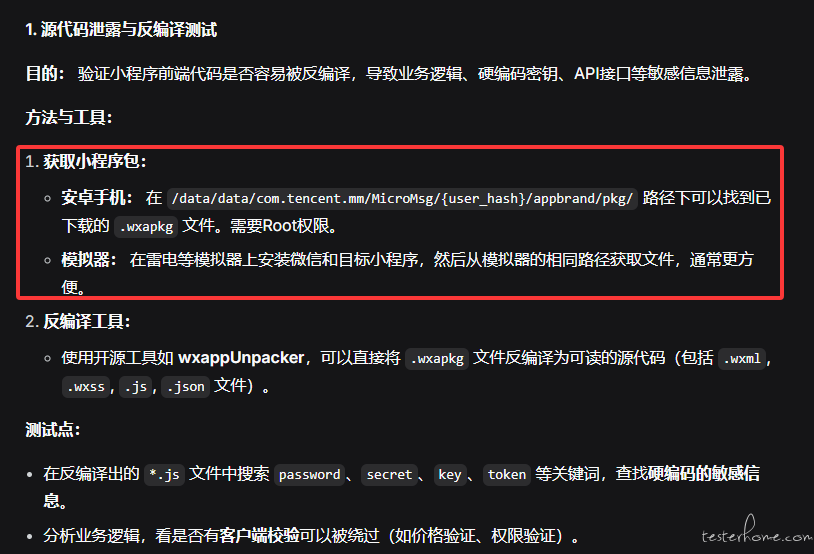 1.安卓用模拟器测试,安装微信,然后提取.wxapkg 文件,进行后续测试,反编译分析,MobSF 扫描,Burp Suite 抓包等