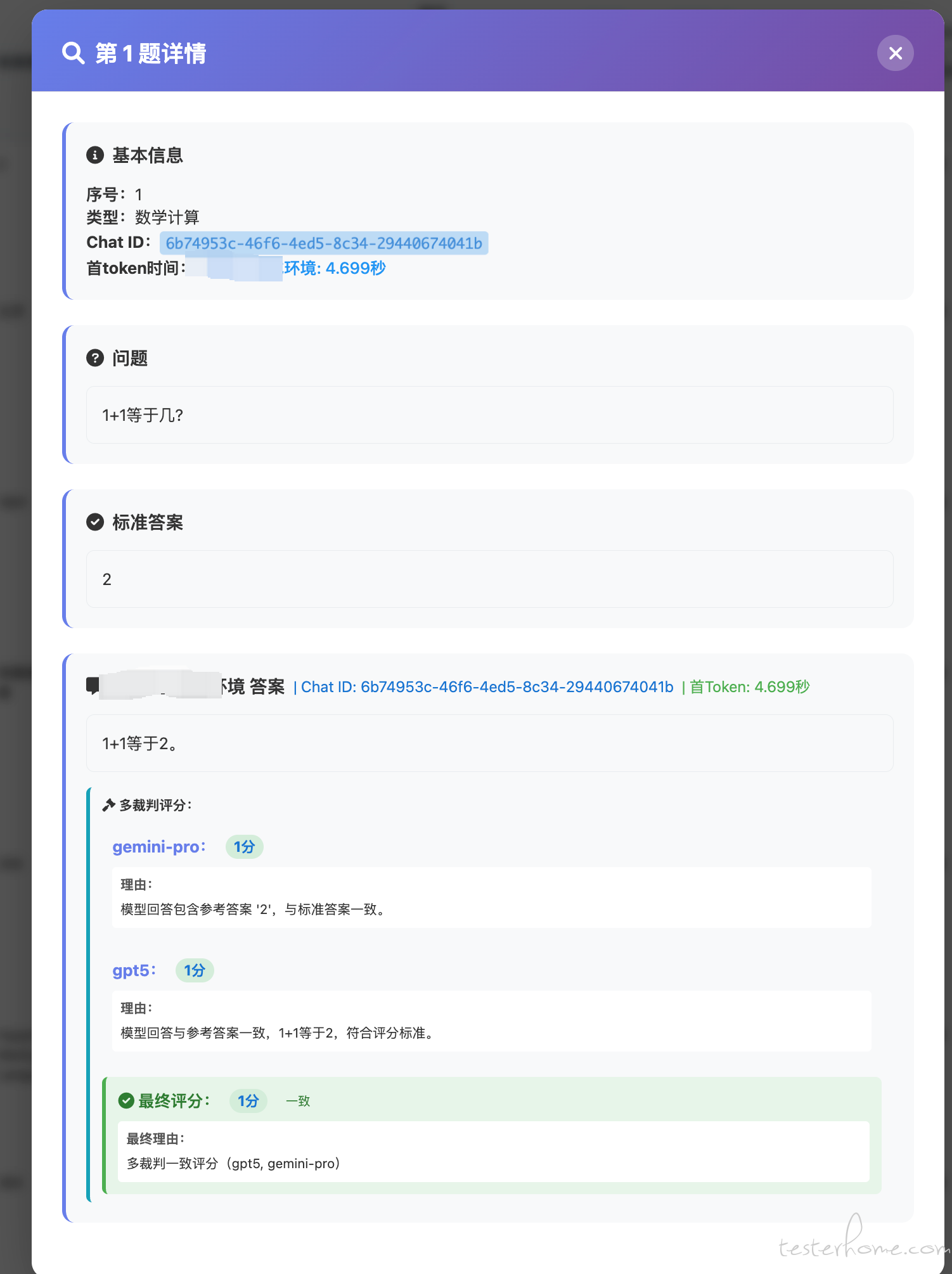 在结果展示的表格中,任何评分不一致的单元格都会以红色高亮标出,提示用户注意。用户可点击该单元格,弹出详细对话框。对话框中将列出此题此模型的答案,以及所有裁判模型各自的评分和评分理由。例如:
