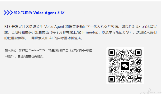 实时互动 × 对话式 AI 的故事才刚开始。欢迎更多对话式 AI 领域的初创项目、投资人和生态伙伴的加入,与 RTE 开发者社区一起重塑人机实时互动体验!想要联系上述项目,或想加入开发者社区合作伙伴者可加微信 Creators2022 咨询,请备注「一句话介绍 +demo day」