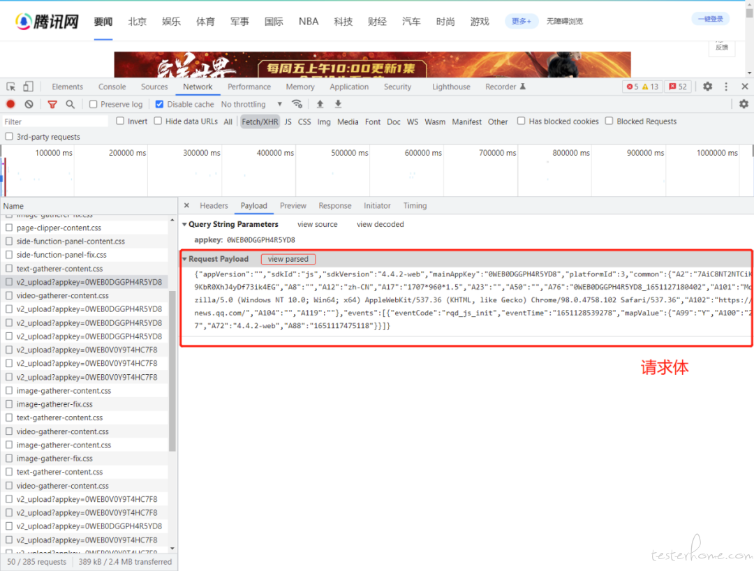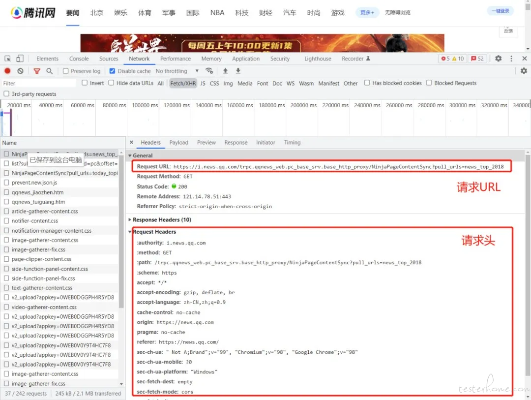 本实践将以 Web 应用为例(某新闻网页),对该页面包含的所有 HTTP(s) 接口进行压力测试。在没有任何文档前提下,我们可以通过浏览器的调试模式(F12),获取与网络相关的接口请求和响应信息,从而设计出压测脚本并执行。
