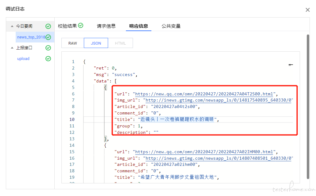 使用工具或平台的调试功能,查看调试日志的响应信息。并与浏览器对应接口的响应信息对比(点击 Response 查看),如图: