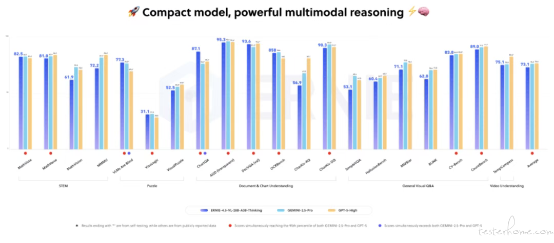根据官方基准测试图表,ERNIE-4.5-VL-28B-A3B-Thinking 在文档和图表理解等多项任务上,其性能表现可与 Gemini 2.5 Pro 和 GPT-5 High 等顶尖模型相媲美,甚至在部分指标上实现超越。