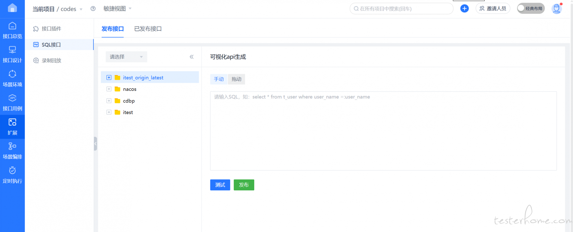 配置好数据源,然后 拖拉方式写 SQL ,同时设置条件,然后发布为一个接口,在接口用例中,就有这个接口了,要验证相关数据的接口 把这个发布的 SQL 接口作为后接口,并加上断言就行了,这就把分散在多地的 SQL 变来接口来用,好维护,可读性也强。
