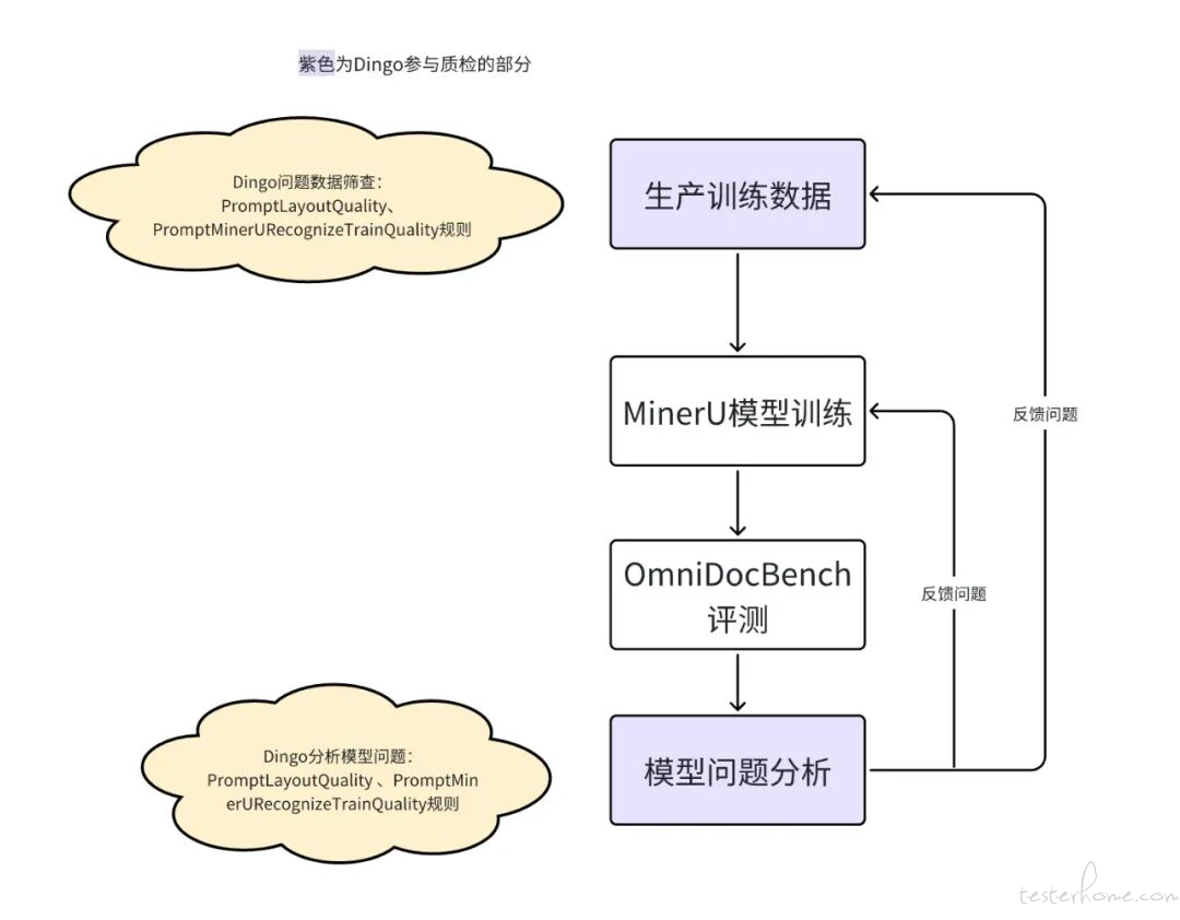 3. 模型诊断:模型训练完成后,除使用 OmniDocBench 进行量化评分外,我们会运用 Dingo 对模型输出进行问题分类与定位,并辅以人工核查,完成系统性 “体检”。