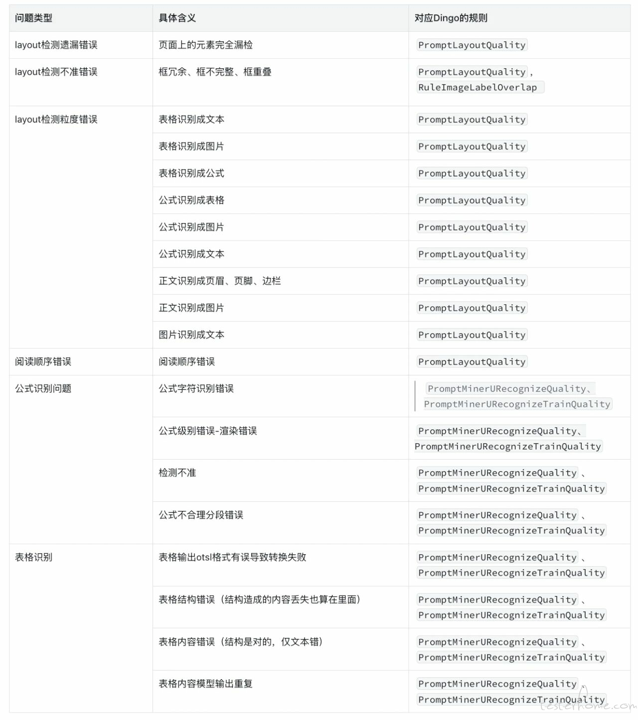 从 layout 结构错误、识别精度偏差到公式与表格解析异常,Dingo 的规则库实现了对 OCR 全链路问题的精细化覆盖。不同类型的检测规则(如 PromptLayoutQuality、PromptMinerURecognizeQuality 等)可灵活组合应用,为模型提供可追溯、可量化的质量诊断依据。