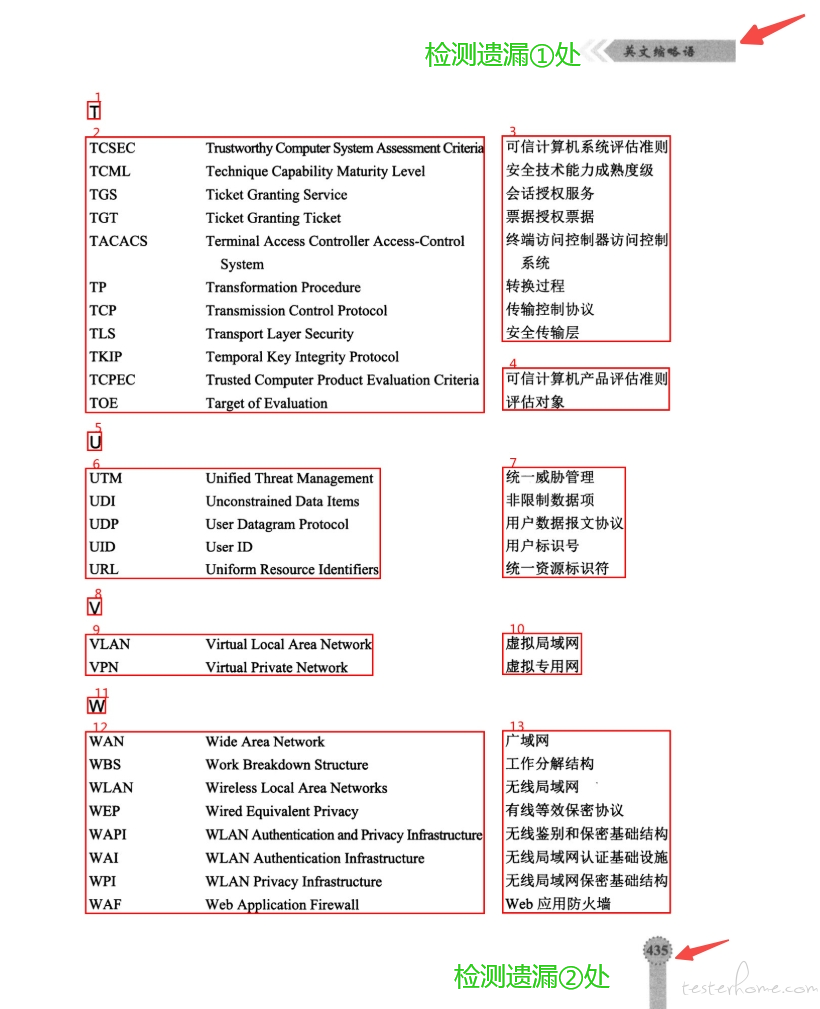 "error_location": "页面上有两处明显的检测遗漏:1. 页面右上角的页眉 '英文缩略语' 未被检测。 2. 页面右下角的页码 '435' 未被检测。",