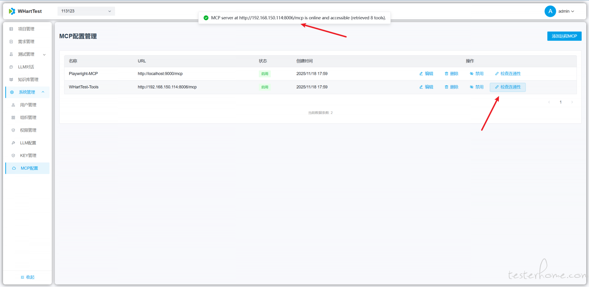 配置好后,点击测试连通性,如图中所示则表示此 mcp 可用(也可以去对话窗口,询问当前有什么工具)
