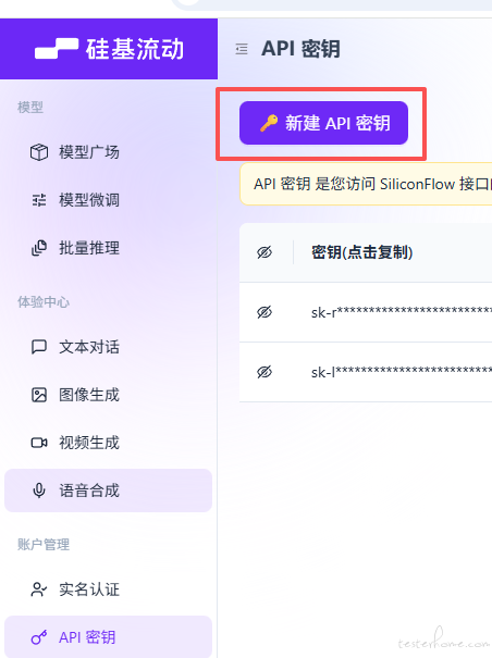 以 “硅基流动” 模型平台为例 ,访问硅基流动官网地址 生成一个密钥