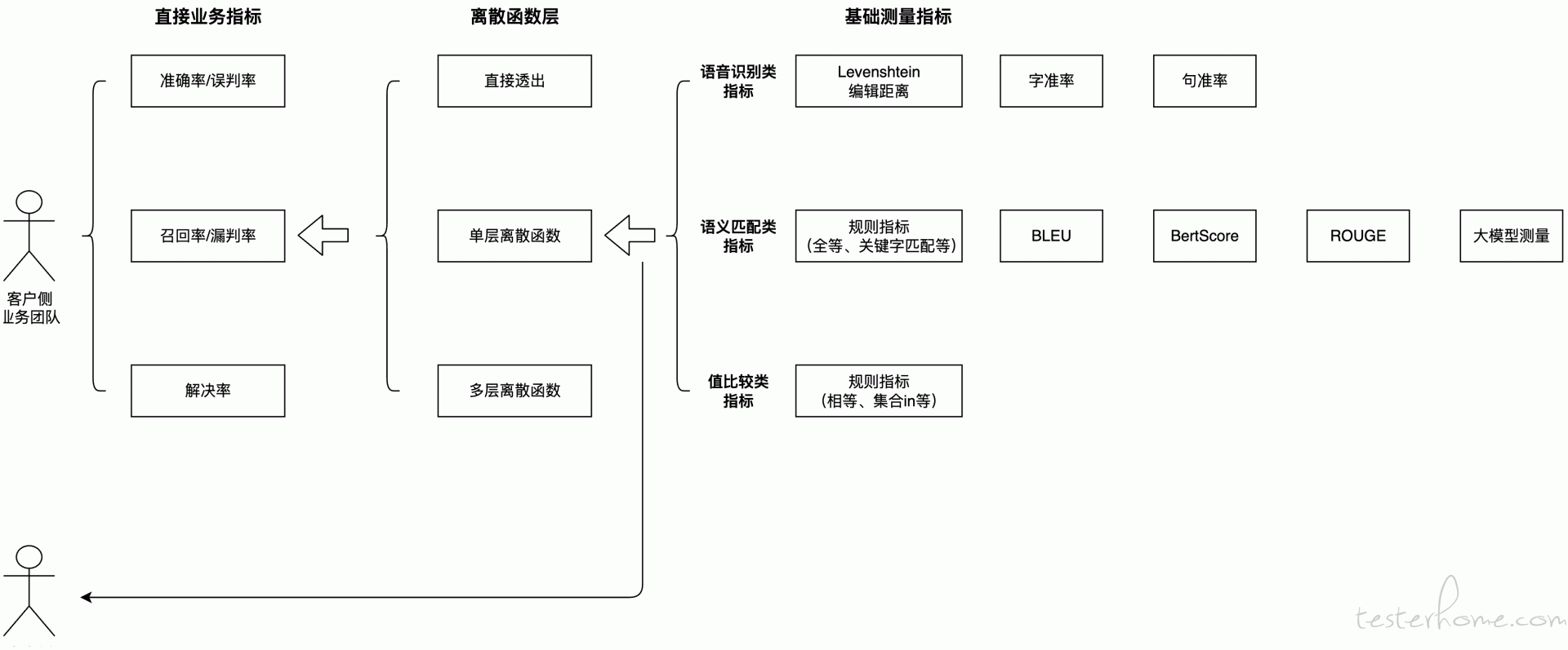 对于一个 AI 算法来说,评测指标的选取一般要经历三个层面:基础测量指标 → 离散函数层 → 直接业务指标。其中基础测量指标为底层指标(例如 Levenshtein 距离、字准率、句准率、BLEU、ROUGE、BERTScore),可以定量的展现评测结果,但不全能展示定性结果;直接业务指标为顶层指标,这是最贴近业务成果的综合性评价,直接回答了 “系统效果好不好”、“业务目标是否达成” 等核心问题;在基础测量指标和直接业务指标之间可能存在一个离散函数层,通过离散函数将基础测量指标中的定量值转化为直接业务指标中的定性值。