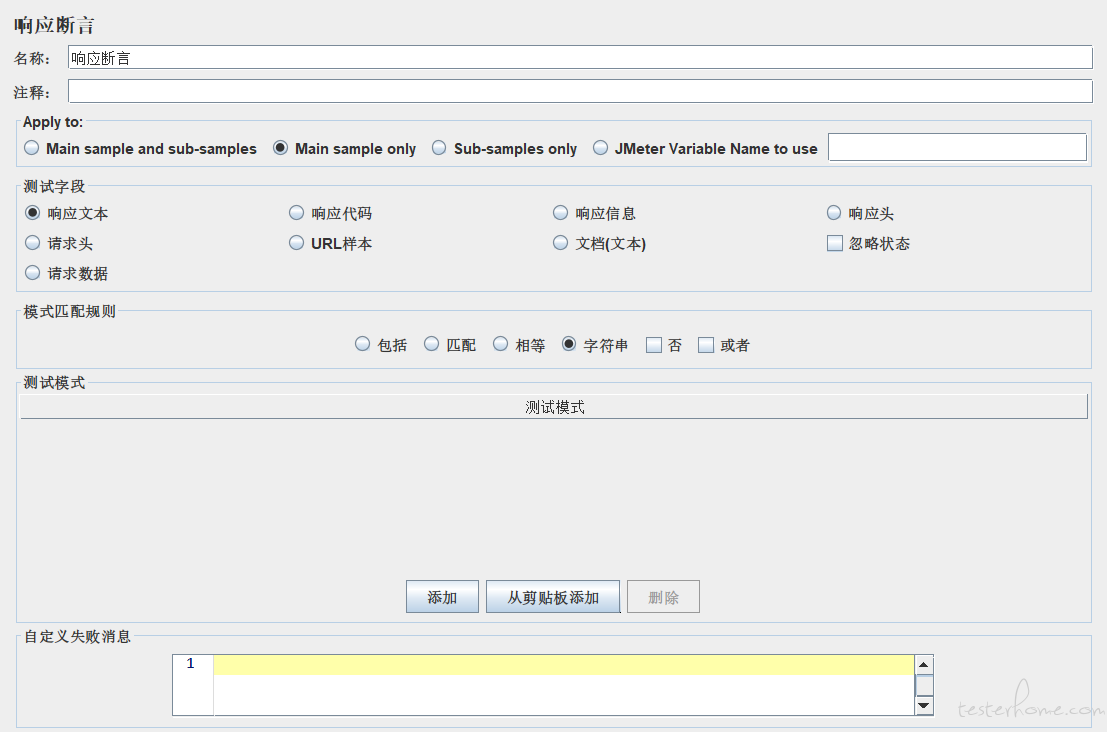 测试计划——>线程组——>HTTP 请求——>(右键添加)断言——>响应断言