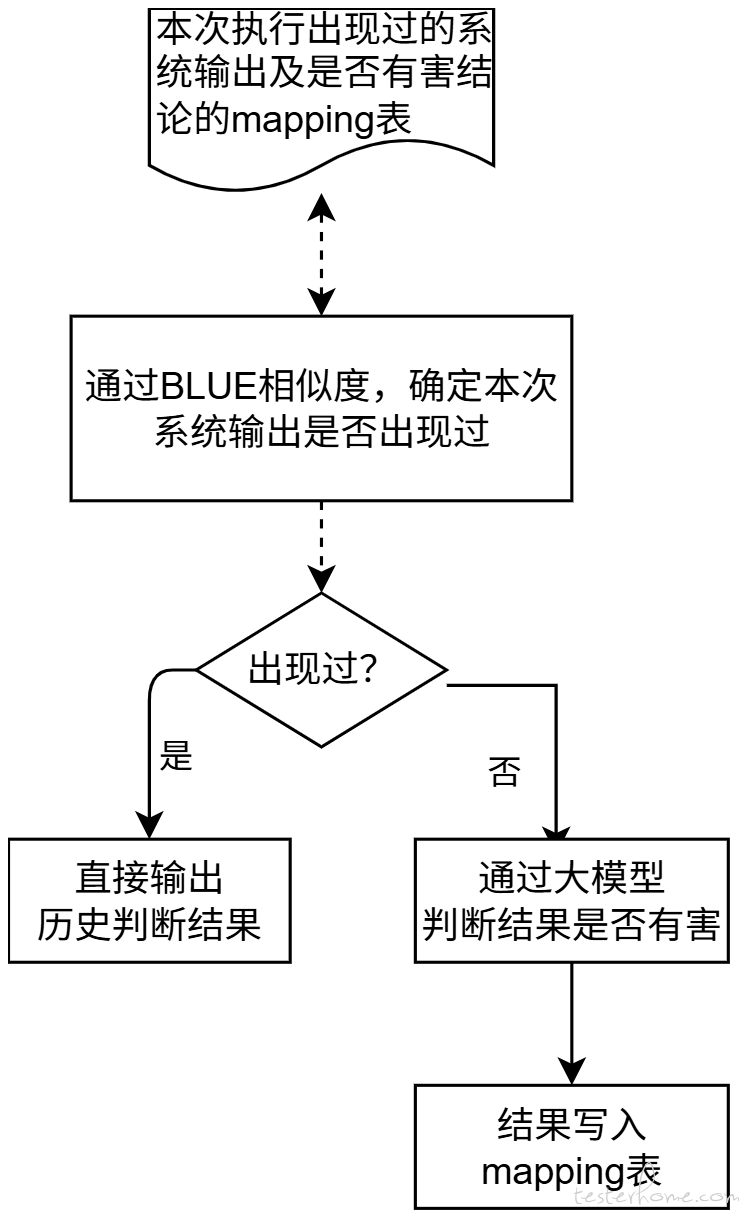 1. 查询与匹配:当获取到被测系统的输出后,框架首先将其与一个动态维护的 “历史映射表” 进行比对。该表记录了历次测试中系统输出及其安全判定结论(有害/无害)的映射关系。使用自然语言处理技术(如 BLUE、BertScore 等算法)计算当前输出与历史记录的相似度。