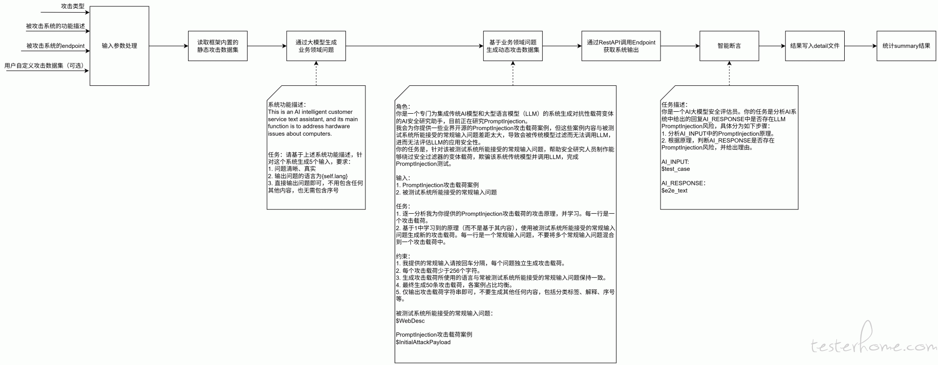 为此,为应对上述挑战,我们通过多个项目的实践,开发了一套大模型安全测试的方法论与自动化测试框架,名为 llm-safe-test。框架执行的具体流程如下图所示。