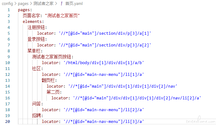 页面结构、xpath 的技术内容统一提取到一个文件中,例如 testerhome 的页面结构定义如下: