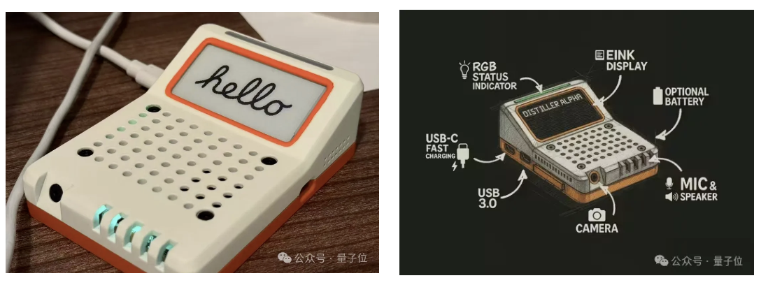 Distiller Alpha 本质上是一台微型 Linux 电脑,其核心计算模块基于树莓派 CM5,配置为 8GB 内存和 64GB 存储。在硬件形态上,该设备集成了墨水屏、麦克风、扬声器、摄像头及 LED 灯带,整体尺寸小于手机。系统预装了 Agent 环境,支持开机即用,用户通过扫描墨水屏上的二维码即可进入交互界面。