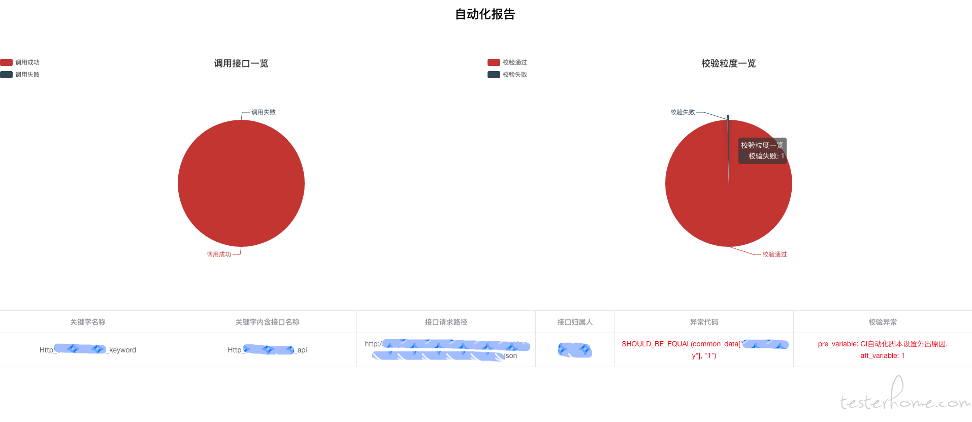 这份报告,省去了冗长的日志打印,直截了当的表明哪个 Keyword 函数异常,Keyword 函数内调用的 Api 函数信息,Api 函数内调用的 api 信息,报错的校验语句,以及错误的具体数据。除此之外,还记录了本次执行调用的接口总数,成功、失败的比例。本次执行过程中校验语句使用的数量,成功、失败的比例。