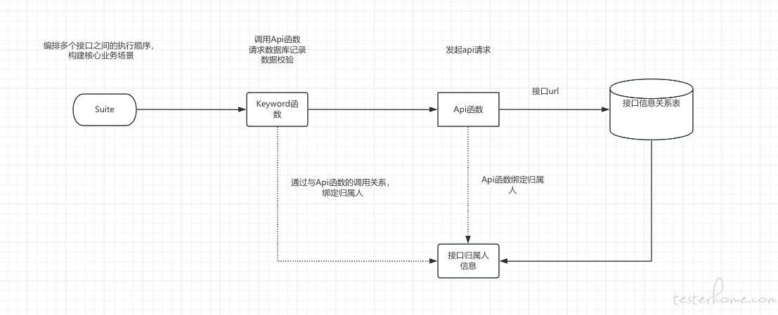 那么该如何做呢?首先得知道接口的负责人是谁,这需要独立维护一张关系表。实际框架运行中,suite 层调用 keyword 层,keyword 层调用 api 层,这些代码内部是嵌套调用的。