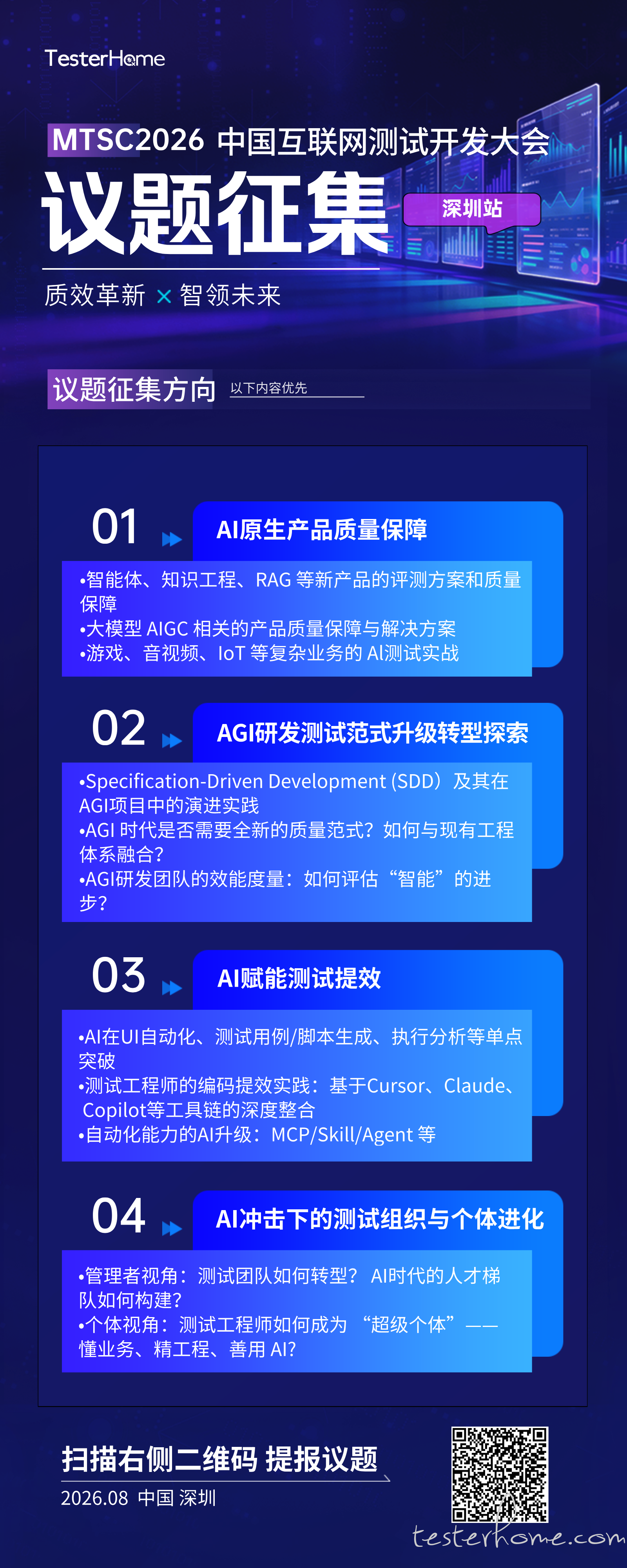 MTSC2026 第十五届中国互联网测试开发大会(深圳站)将于 2026 年 8 月在深圳举行。