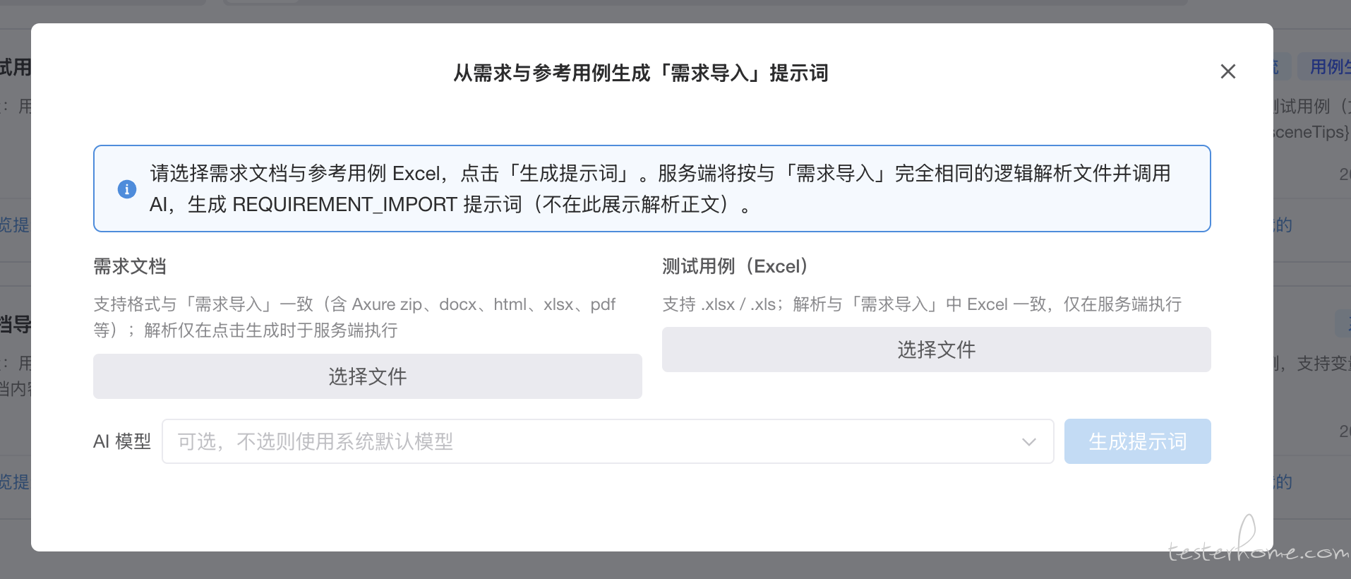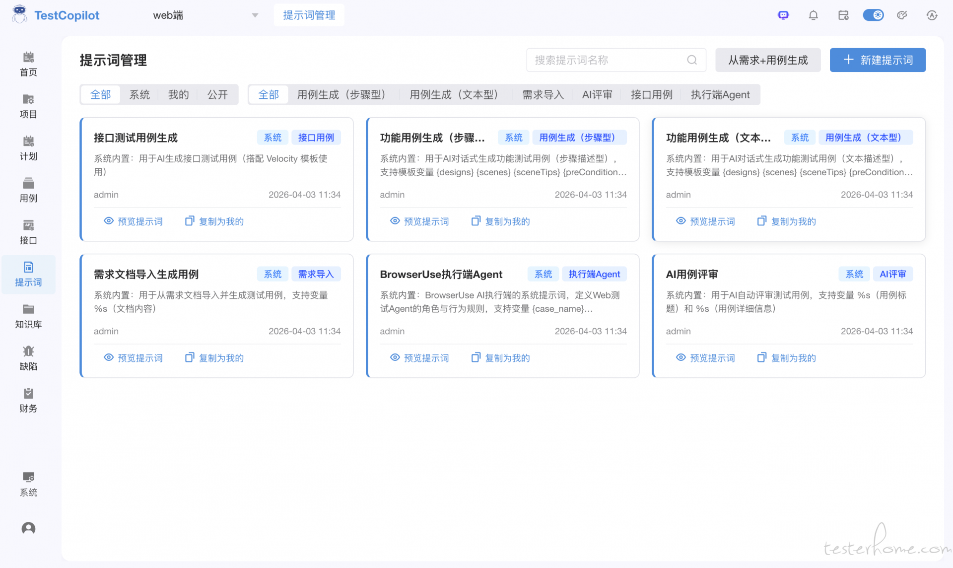 另外,我们也针对不同的场景,提供了自定义提示词功能,比如从需求导入,到 AI 执行功能测试的时候的提示词都可以自定义。