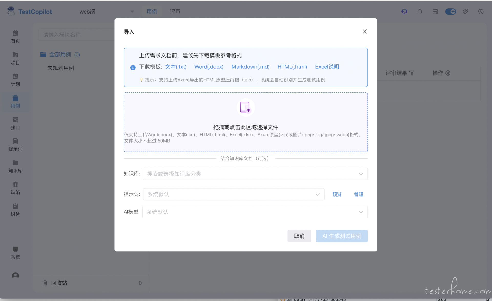 目前我们支持 Word、PDF、Markdown、Axure、蓝湖等导出的 HTML 生成测试用例,但是实际生成的效果时好时坏。